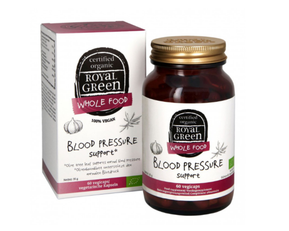 ROYAL GREEN BIO Blood pressure support- tai natūralus būdas palaikyti normalų kraujospūdį ir normalią kraujotaką* Šio papildo sudėtyje yra 100% sertifikuotas ekologiškas juodasis valgomasis česnakas, koncentruoti raudonojo tikrojo vynmedžio ir Europinio alyvmedžio lapai. Europinio alyvmedžio (alyvuogių) lapų ekstrakte yra ne mažiau kaip 5% oleuropeino – natūralaus antioksidanto, kuris paprastai randamas ir lapuose, ir pačiose alyvuogėse. Česnakai yra auginami Ispanijoje. Po derliaus nuėmimo jie yra fermentuojami, todėl yra išskirtinės juodos spalvos. Fermentacijos metu susidaro biologiškai aktyvus junginys S-alilcisteinas. Papildomas privalumas yra tas, kad fermentacija pašalina stiprų česnako kvapą ir skonį. Jau senovėje dėl naudingųjų savybių buvo naudojami ir raudonojo tikrojo vynmedžio lapai. Derlius renkamas rudenį, kai lapai būna gražios raudonos spalvos. Tai unikali formulė iš ekologiškų augalų, be sintetinių ingredientų ar užpildų.